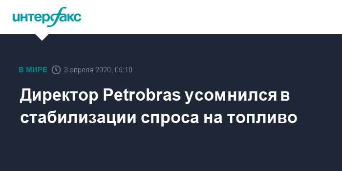 Москва. 3 апреля. INTERFAX.RU - Исполнительный директор бразильской нефтяной компании Petrobras Кастелло Бранко считает, что переговоры о стабилизации мировых цен на нефть между нефтедобывающими компаниями не могут стабилизировать цену на топливо из-за падения спроса в условиях распространения коронавируса.