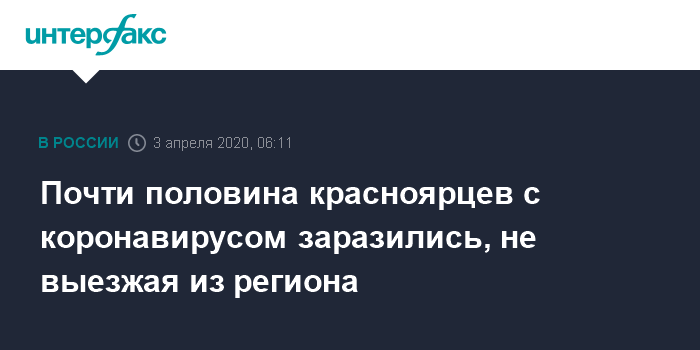 Москва. 3 апреля. INTERFAX.RU - Из 25 жителей Красноярска, у которых выявлен коронавирус, 12 заразились Сovid-19, не выезжая за пределы края, сообщает в пятницу пресс-служба регионального управления Роспотребнадора.