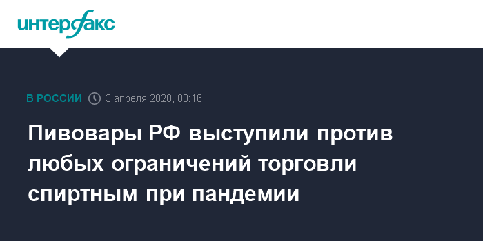 Москва. 3 апреля. INTERFAX.RU - Союз российских производителей пивобезалкогольной продукции (Союз пивоваров) обратился к премьер-министру РФ Михаилу Мишустину с просьбой на время ввести единые федеральные правила оборота пивоваренной продукции, чтобы не допустить ограничений, которые вводят региональные власти в рамках мер по борьбе с распространением коронавируса; Союз также выступил против любых ограничений торговли спиртным во время пандемии.