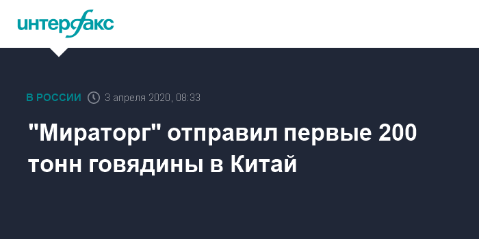 Москва. 3 апреля. INTERFAX.RU - "Мираторг", один из крупнейших производителей свинины и говядины в России, первой из российских компаний приступил к поставкам говядины в Китай.