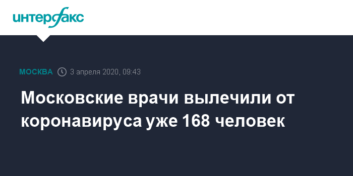 "В Москве выздоровели еще 28 пациентов, у которых ранее был подтвержден диагноз "коронавирусная инфекция". Всего в Москве на сегодняшний день уже 168 (выздоровевших - ИФ)", - сказала Ракова журналистам в пятницу.
