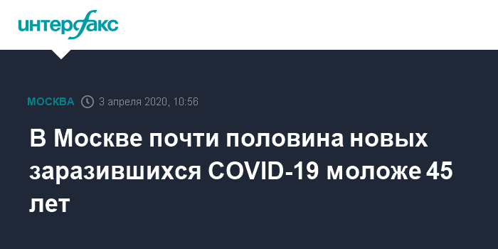 Москва. 3 апреля. INTERFAX.RU - В Москве число заразившихся коронавирусом за сутки выросло на 448, из них 199 - люди в возрасте от 18 до 45 лет и еще 17 - дети, сообщили в городском оперативном штабе по борьбе с COVID-19. Общее число подтвержденных случаев заражения достигло 2923.
