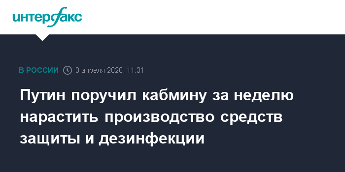 Москва. 3 апреля. INTERFAX.RU - Президент России Владимир Путин поручил правительству РФ до 10 апреля обеспечить наращивание производства средств индивидуальной защиты и дезинфекции, а также их поставку в необходимых объемах и создание резерва. Соответствующее поручение опубликовано на сайте Кремля.