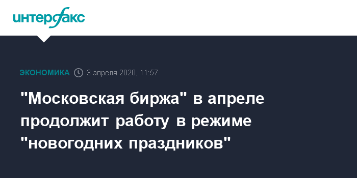 Москва. 3 апреля. INTERFAX.RU - В связи с продлением нерабочих дней до 30 апреля "Московская биржа" продолжит в апреле работу в режиме, в котором работает с 30 марта - как на длинные праздники.