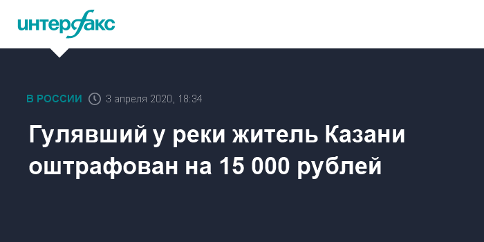 Москва. 3 апреля. INTERFAX.RU - В Казани мировой судья Ново-Савиновского района Казани оштрафовал на 15 000 рублей 23-летнего жителя города за прогулку по берегу Казанки, ради чего он нарушил режим самоизоляции, сообщает пресс-служба президента Татарстана.