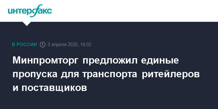 Москва. 3 апреля. INTERFAX.RU - Минпромторг попросил Минтранс решить проблему с получением пропусков на межрегиональные перевозки продуктов питания и товаров первой необходимости, возникшую из-за ужесточения внутренних правил регионов.
