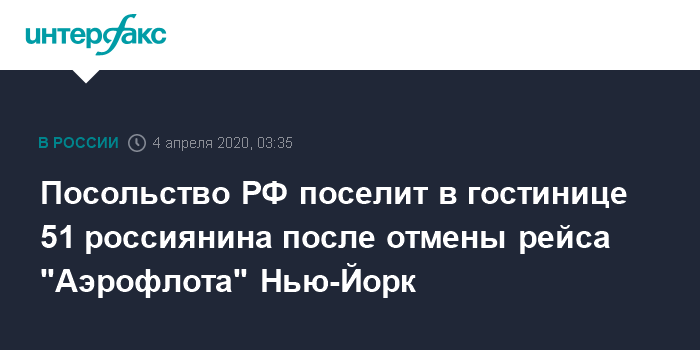 Ранее пресс-секретарь Генконсульства РФ в Нью-Йорке Алексей Топольский сообщил "Интерфаксу", что как минимум 250 россиян должны были вылететь вечером 3 апреля рейсом авиакомпании "Аэрофлот" Нью-Йорк - Москва, который был отменен.