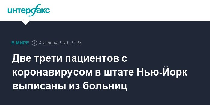 Москва. 4 апреля. INTERFAX.RU - Две трети пациентов с коронавирусом выписаны из больниц штата Нью-Йорк, сообщил губернатор Эндрю Куомо в субботу журналистам.