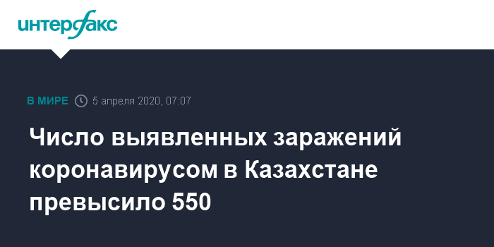 Москва. 5 апреля. INTERFAX.RU - Число случаев заражения коронавирусом COVID-19 в Казахстане к утру воскресенья увеличилось до 551, сообщил республиканский оперативный штаб.