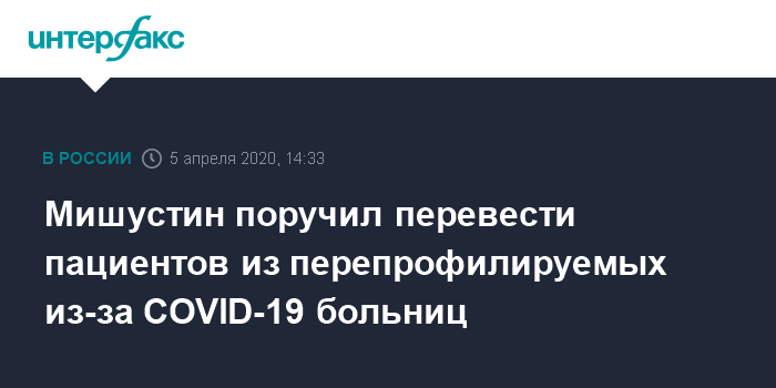 Москва. 5 апреля. INTERFAX.RU - Премьер РФ Михаил Мишустин поручил Минздраву организовать перевод пациентов из федеральных медицинских организаций, планируемых к перепрофилированию в связи с коронавирусом.