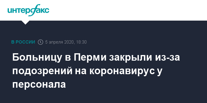 Москва. 5 апреля. INTERFAX.RU - У нескольких сотрудников Пермской краевой клинической инфекционной больницы подозревают заражение COVID-19, говорится в официальном телеграм-канале "Стоп коронавирус. Пермь".