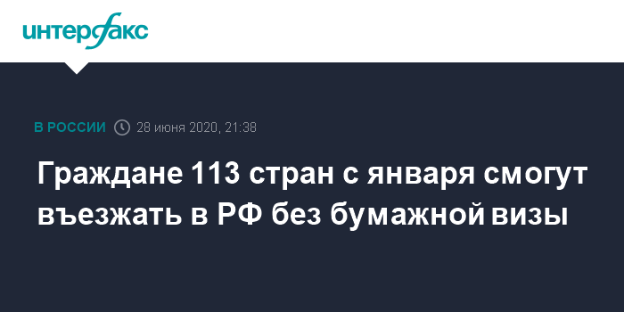 Москва. 28 июня. INTERFAX.RU - Граждане 113 стран смогут въезжать в Россию без оформления бумажной визы, сообщил "Ъ" замглавы МИД РФ Евгений Иванов.
