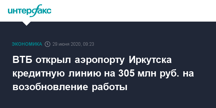 Москва. 29 июня. INTERFAX.RU - АО "Международный аэропорт Иркутск" привлекло в ВТБ кредитную линию с лимитом 305,3 млн рублей на возобновление деятельности, сообщается на сайте госзакупок.