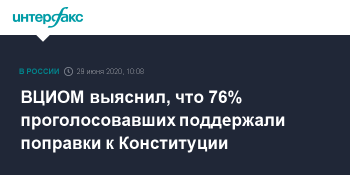 Москва. 29 июня. INTERFAX.RU - Изменения в Основной закон РФ за период с 25 по 28 июня поддержали 76% респондентов, принявших участие в голосовании, свидетельствуют распространенные в понедельник данные экзит-пола ВЦИОМ.