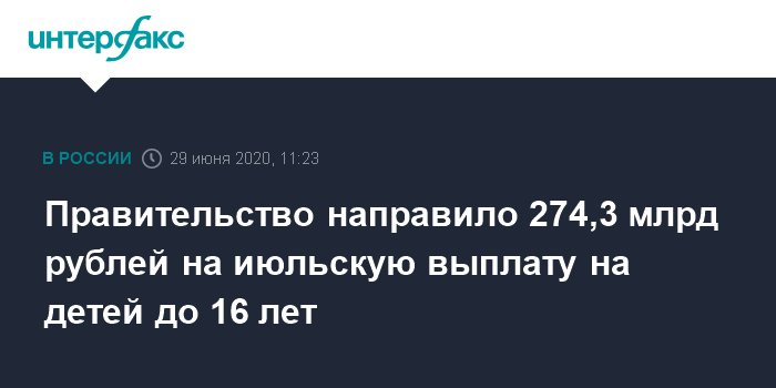 Москва. 29 июня. INTERFAX.RU - Правительство России выделяет из резервного фонда 274,3 млрд рублей на выплаты по 10 тысяч рублей российским семьям с детьми не старше 16 лет.