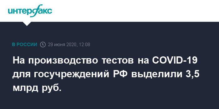 Москва. 29 июня. INTERFAX.RU - Правительство РФ выделило около 3,5 млрд рублей на производство тест-систем на коронавирус для их использования в государственных и муниципальных учреждениях, сообщил премьер Михаил Мишустин.