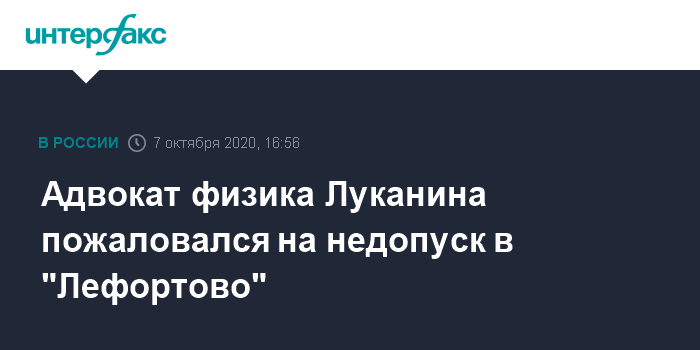 Москва. 7 октября. INTERFAX.RU - Защита томского физика Александра Луканина, арестованного по обвинению в госизмене, пожаловалась в Генпрокуратуру, Лефортовский суд и начальству Следственного управления ФСБ на фактический недопуск к подзащитному. Об этом сообщил адвокат Дмитрий Мыльцын. Луканин содержится в "Лефортово".