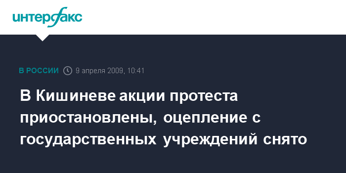 Москва. 9 апреля. INTERFAX.RU - В четверг в Кишиневе акции протеста приостановлены, в центре города ситуация спокойная, нет даже групп людей, которые были накануне утром перед акциями протеста.