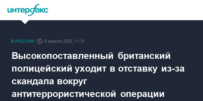 Москва. 9 апреля. INTERFAX.RU - Скандал, разгоревшийся вокруг крупной антитеррористической операции, вынудил высокопоставленного британского полицейского Боба Куика покинуть свой пост, сообщает в четверг британский телеканал "Скай-ньюз".