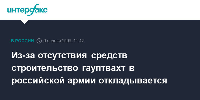 Москва. 9 апреля. INTERFAX.RU - Строительство и реконструкция 142 гарнизонных гауптвахт российской армии откладывается из-за отсутствия финансовых средств, сообщил "Интерфаксу-АВН" в четверг источник в российском военном ведомстве.
