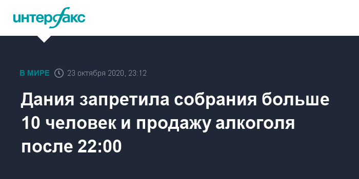 Москва. 23 октября. INTERFAX.RU - Власти Дании приняли решение ужесточить лимит на собрания в группах с 50 до 10 человек, а также запретить продажу алкоголя после 22:00, чтобы предотвратить распространение коронавирусной инфекции, пишет в пятницу The Guardian.
