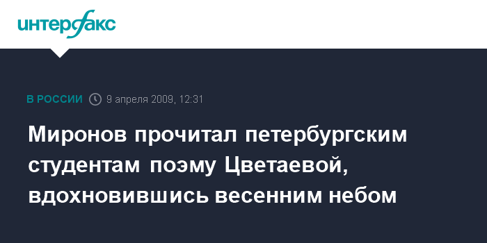 Москва. 9 апреля. INTERFAX.RU - Студенты Петербургского педагогического госуниверситета им. А.И.Герцена вместо запланированного доклада об образовании неожиданно для себя услышали от председателя Совета Федерации Сергея Миронова поэму Марины Цветаевой "Стенька Разин".
