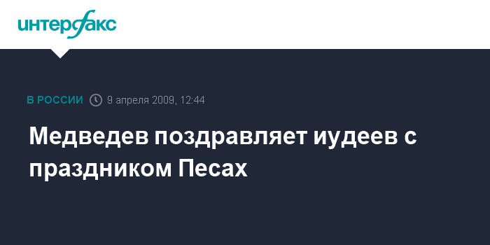 Москва. 9 апреля. INTERFAX.RU - Президент РФ Дмитрий Медведев поздравил российских иудеев с праздником Песах.
