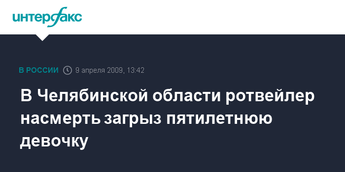 Как сообщила в четверг агентству "Интерфакс-Урал" помощник руководителя следственного управления СКП РФ по Челябинской области Елена Калинина, несчастный случай произошел вечером 7 апреля во дворе частного дома. "Домашний пес породы ротвейлер напала на девочку, когда та вышла во двор. Выбежавшая бабушка постаралась оттащить собаку. Девочку доставили в больницу, где она утром 8 апреля от полученных укусов скончалась", - рассказала Калинина. По ее словам, погибшая девочка была из благополучной семьи. Собаку после нападения на ребенка сразу убили.