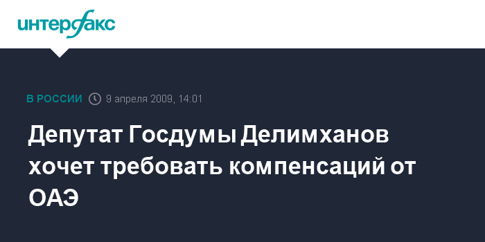 Москва. 9 апреля. INTERFAX.RU - Депутат Госдумы от Чечни Адам Делимханов намерен потребовать компенсации морального и материального вреда российским гражданам, которые были задержаны в Дубае в связи с покушением на экс-командира батальона "Восток" Сулима Ямадаева.