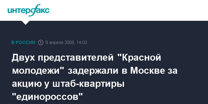 Москва. 9 апреля. INTERFAX.RU - В Центральном округе столицы задержаны два представителя общественно-политического движения "Красная молодежь", приковавшие себя наручниками к ограде возле штаб-квартиры московского городского отделения "Единой России", сообщили "Интерфаксу" в управлении информации и общественных связей ГУВД столицы.