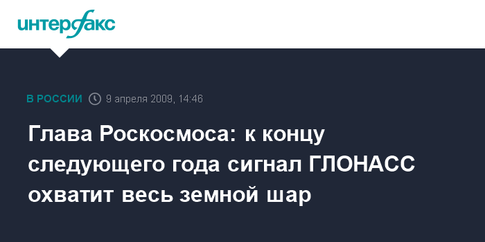 Москва. 9 апреля. INTERFAX.RU - К концу 2010 года навигационный сигнал российской спутниковой системы ГЛОНАСС будет охватывать территорию всей планеты, заявил журналистам в четверг в Москве глава Роскосмоса Анатолий Перминов.