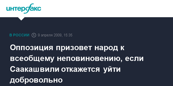 Москва. 9 апреля. INTERRFAX.RU - Лидеры грузинской оппозиции планируют призвать народ Грузии к всеобщему неповиновению в случае, если президент Михаил Саакашвили откажется добровольно уйти в отставку, заявила на митинге в Тбилиси один из лидеров оппозиции Эка Беселия.