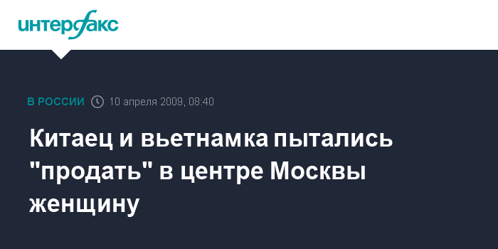 Москва. 10 апреля. INTERFAX.RU - Сотрудники правоохранительных органов задержали в четверг вечером гражданина Китая и гражданку Вьетнама, пытавшихся продать женщину в центре города.