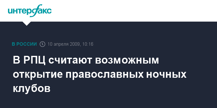 Москва. 10 апреля. INTERFAX.RU - В Московском патриархате не исключают возможности открытия православных ночных клубов как дополнительных мест общения верующей интеллектуальной молодежи.