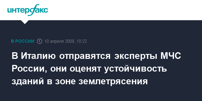 Москва. 10 апреля. INTERFAX.RU - МЧС России направляет в Италию группу экспертов для оценки устойчивости зданий, подвергшихся воздействию землетрясения, сообщила начальник Управления информации МЧС России Ирина Адрианова.