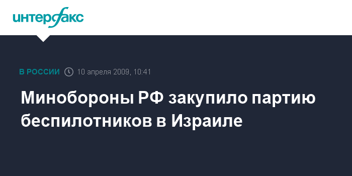 Москва. 10 апреля. INTERFAX.RU - Министерство обороны России заключило контракт с израильской фирмой на поставку партии беспилотных летательных аппаратов, сообщил заместитель министра обороны РФ по вооружению Владимир Поповкин.
