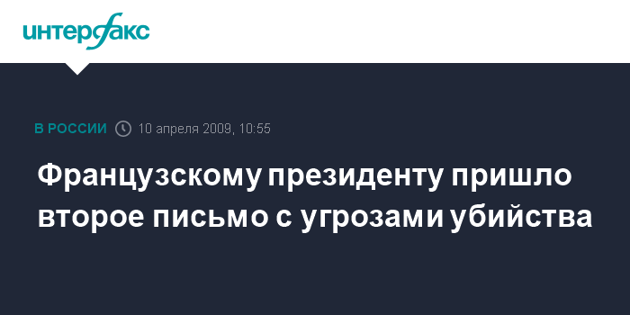 Москва. 10 апреля. INTERFAX.RU - В администрации президента Франции Николя Саркози получено еще одно письмо с угрозами убийства в адрес главы государства и двумя пулями.