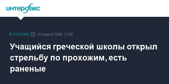 Москва. 10 апреля. INTERFAX.RU - Учащийся одной из Школ трудовых резервов Греции в городе Рентисе в пятницу утром открыл стрельбу по находившимся рядом людям, а затем выстрелил в себя, сообщает греческое телевидение.