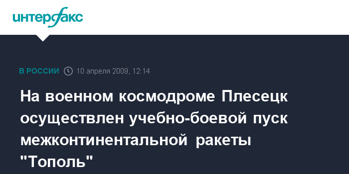 Москва. 10 апреля. INTERFAX.RU - Учебно-боевой пуск межконтинентальной баллистической ракеты РС-12М "Тополь" осуществлен в пятницу с космодрома Плесецк совместным боевым расчетом Ракетных войск стратегического назначения (РВСН) и Космических войск, сообщил "Интерфаксу-АВН" помощник командующего РВСН полковник Александр Вовк.