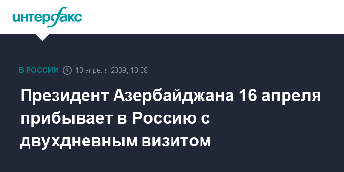 Москва. 10 апреля. INTERFAX.RU - Президент Азербайджанской Республики Ильхам Алиев 16-17 апреля посетит Россию с рабочим визитом по приглашению президента России Дмитрия Медведева, сообщает пресс-служба Кремля.