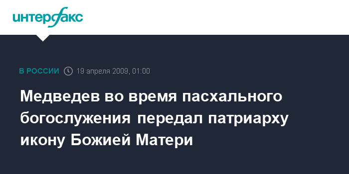 Медведев во время пасхального богослужения передал патриарху икону Божией Матери