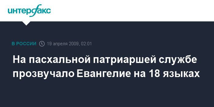 Москва. 19 апреля. ИНТЕРФАКС - В Москве на праздничной ночной литургии в честь Пасхи в воскресенье в храме Христа Спасителя отрывок из Евангелия от Иоанна прозвучал на 18 языках.