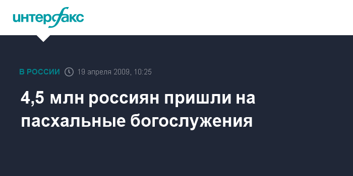 Москва. 19 апреля. INTERFAX.RU - 4,5 млн человек приняли участие в пасхальных богослужениях по всей стране - данные МВД РФ.