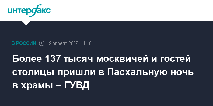 Москва. 19 апреля. INTERFAX.RU - В пасхальных богослужениях в храмах и монастырях в российской столице уже приняло участие свыше 250 тыс. человек.