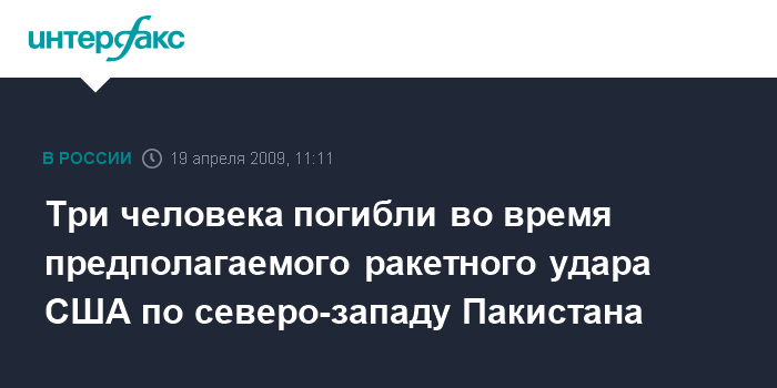 Лондон. 19 апреля. INTERFAX.RU - Три человека погибли, еще пятеро были ранены в результате ракетного удара, нанесенного с беспилотного летательного аппарата по боевикам в регионе Южный Вазаристан на северо-западе Пакистана, сообщает в воскресенье британская телерадиокорпорация Би-би-си со ссылкой на заявление местных правоохранительных органов.