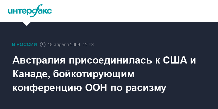 Сидней. 19 апреля. INTERFAX.RU - МИД Австралии в воскресенье заявил о намерении страны присоединиться к бойкоту конференции ООН по расизму, которая состоится в Женеве на следующей неделе.