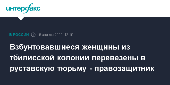 Тбилиси. 19 апреля. INTERFAX.RU - Часть заключенных женщин из тбилисского исправительного учреждения № 5, где вчера вечером был поднят бунт, переведена в руставскую тюрьму № 1, сообщила журналистам в понедельник руководитель неправительственной организации "Бывшие политзаключенные за права человека" Нана Какабадзе.