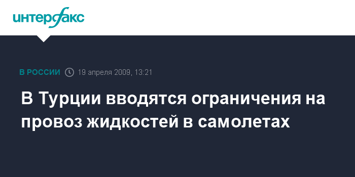 Москва. 19 апреля. INTERFAX.RU - С 20 апреля на территории Турции вводятся правила, согласно которым строго ограничивается провоз авиапассажирами различных жидкостей в ручной клади, сообщили в московском представительстве авиакомпании Turkish Airlines.
