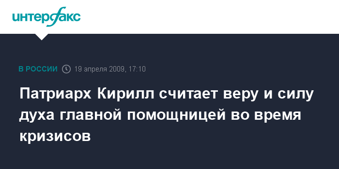 Москва. 19 апреля. INTERFAX.RU - Патриарх Московский и всея Руси Кирилл считает, что крепкая вера поможет справиться с любым кризисом, в том числе с тем, который сегодня переживает глобальная экономика.