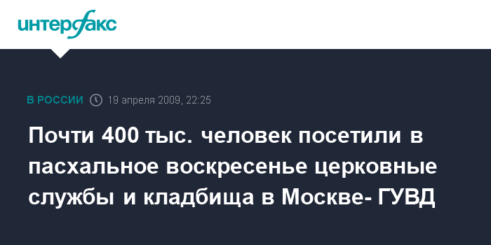 Москва. 19 апреля. ИНТЕРФАКС-МОСКВА - В пасхальное воскресенье московские храмы посетили 395 тыс. 400 человек , а также городские и загородные кладбища столицы.